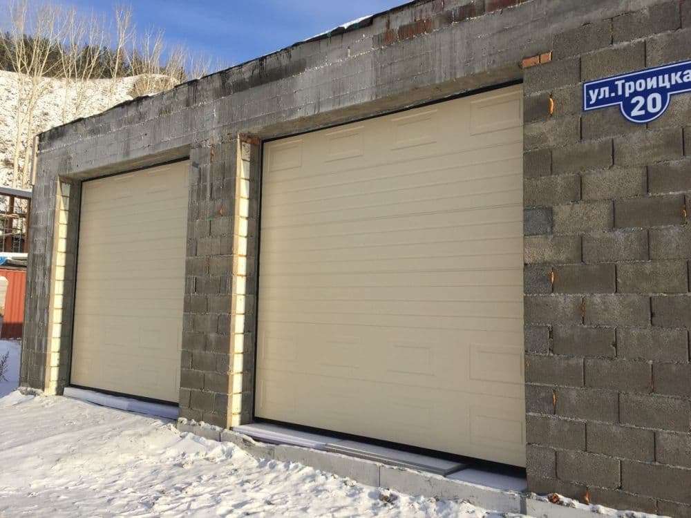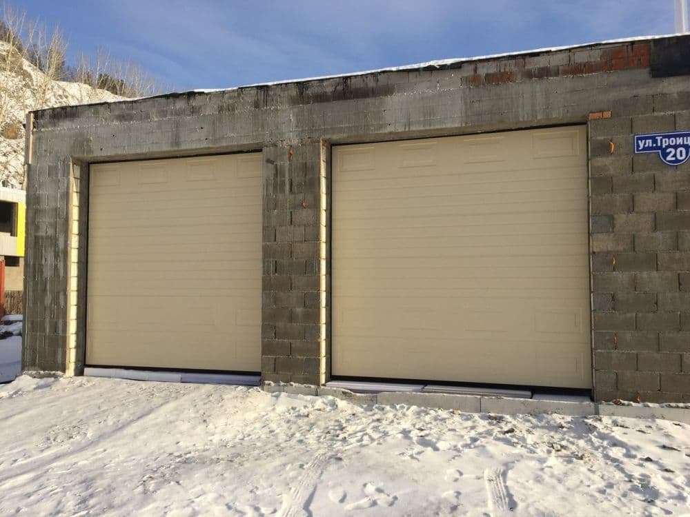 Установлены 2 ворот Алютех Классик, 45 панель, цвет слоновая кость, с вставками панелей типа филенка.